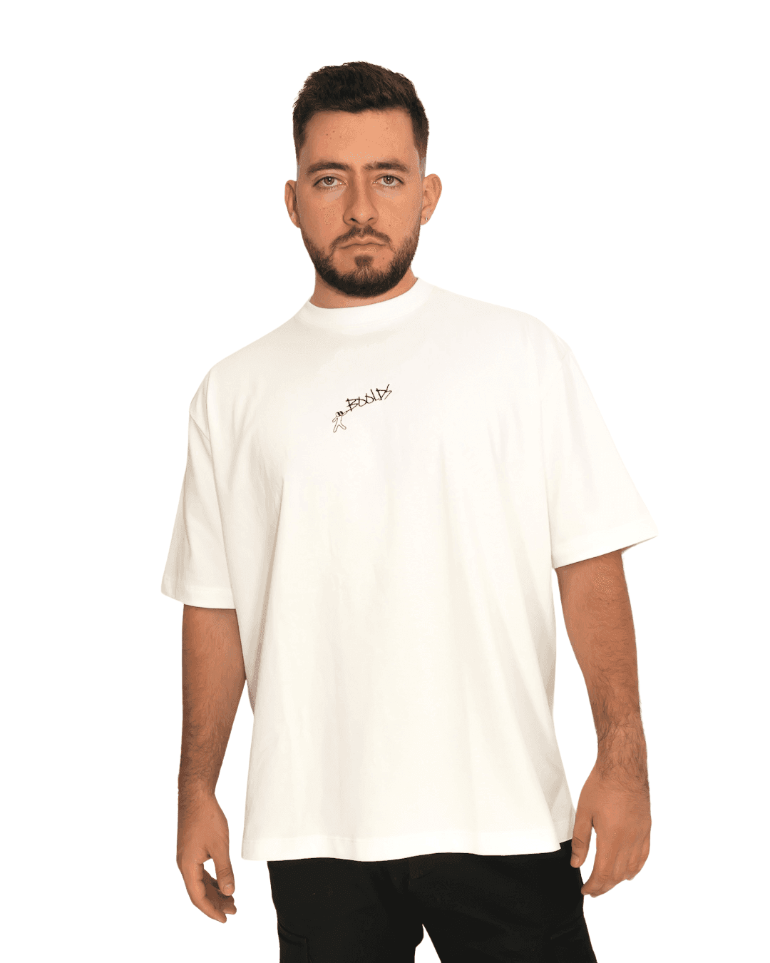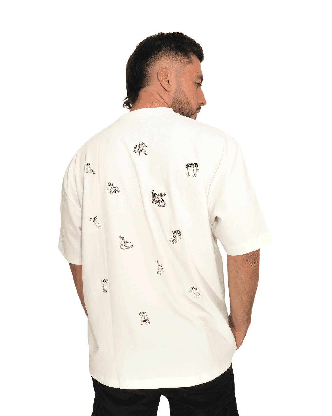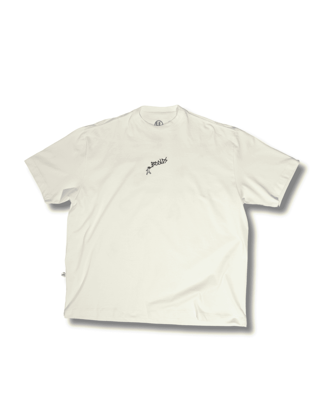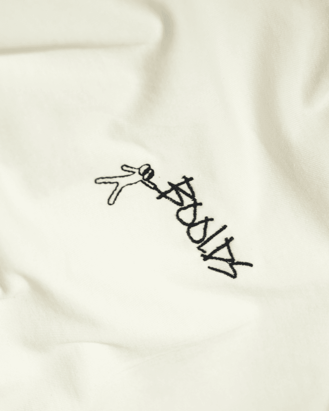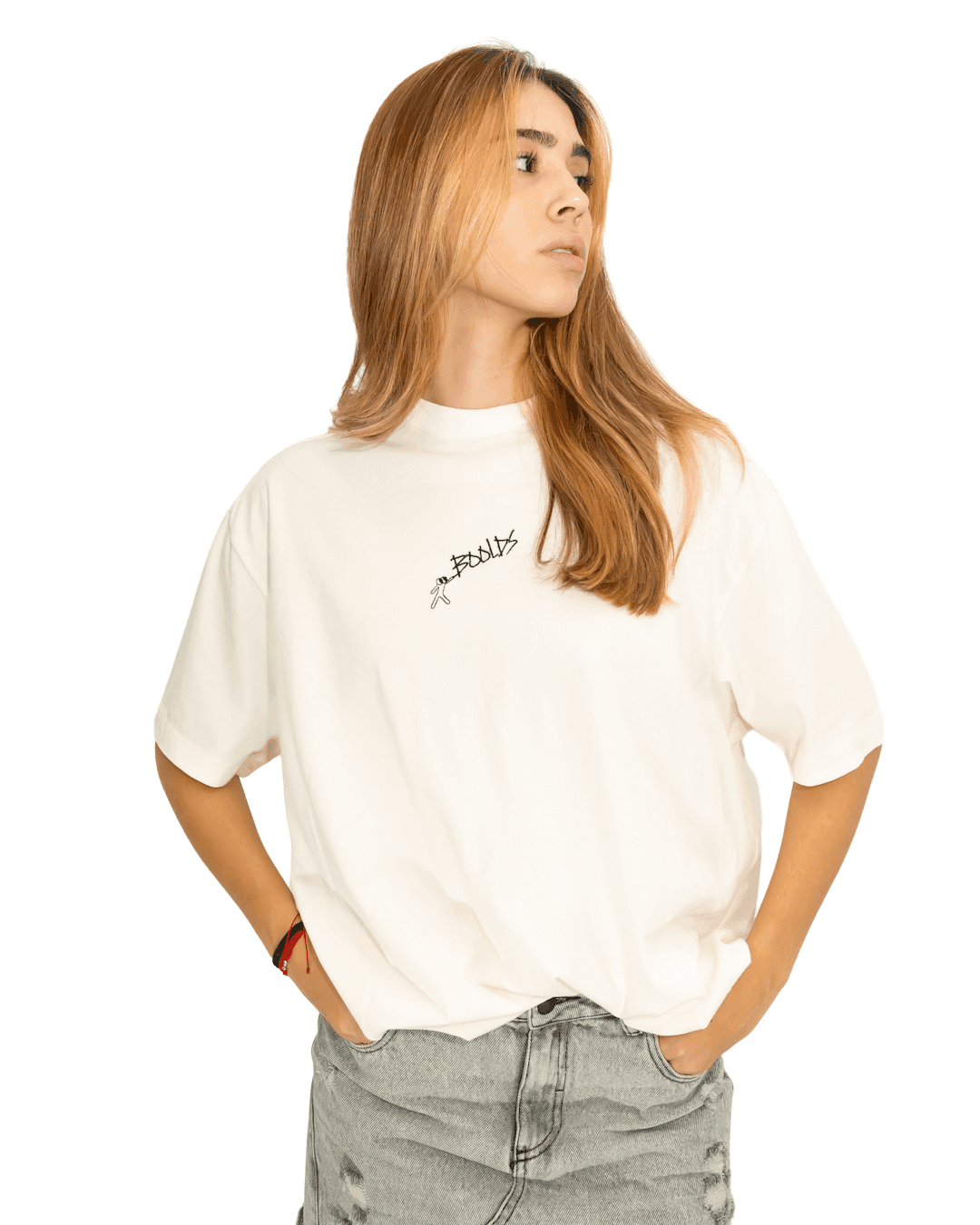 Camiseta color crudo en silueta oversized, tela de 150g en algodón 100%. Diseño con detalles bordados en hilo negro en la espalda y frente.
