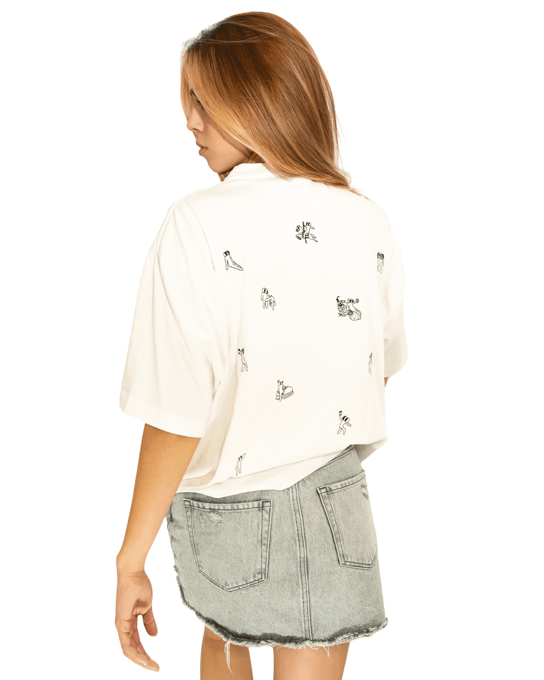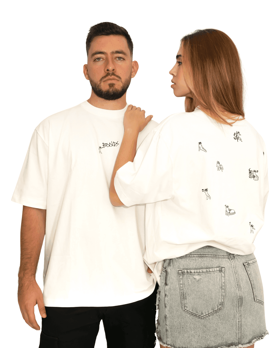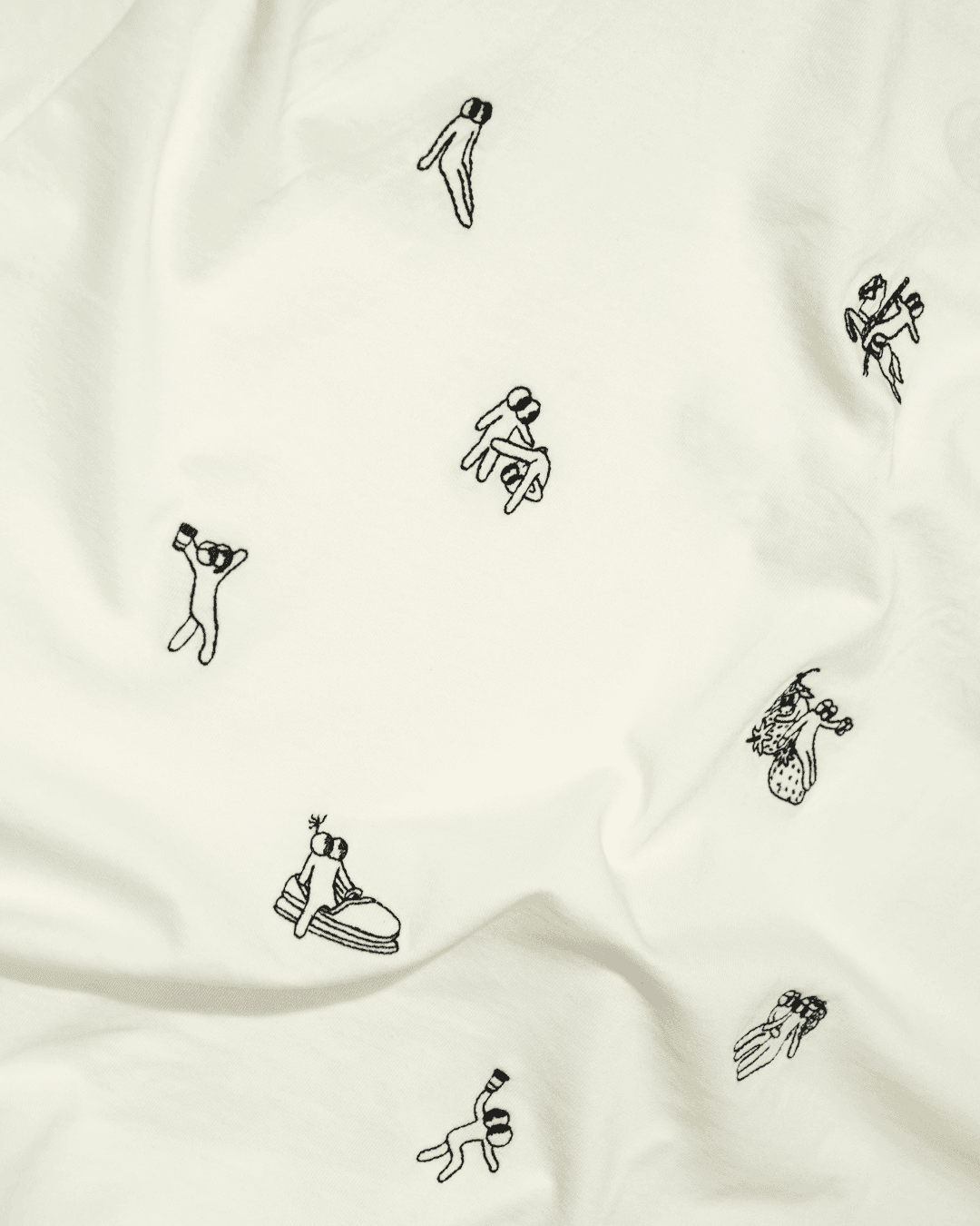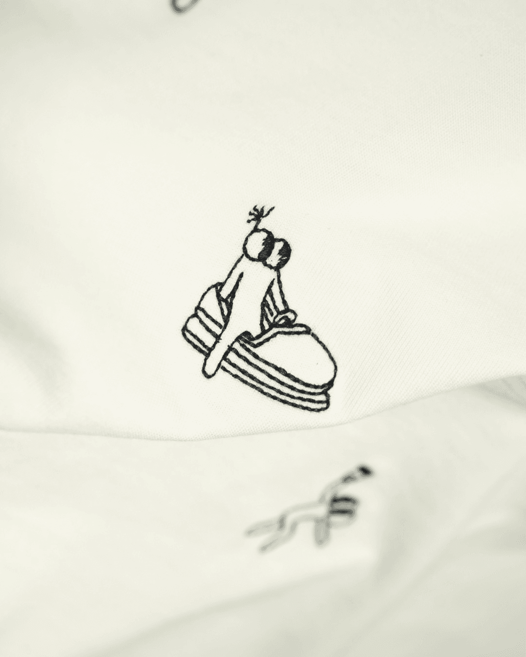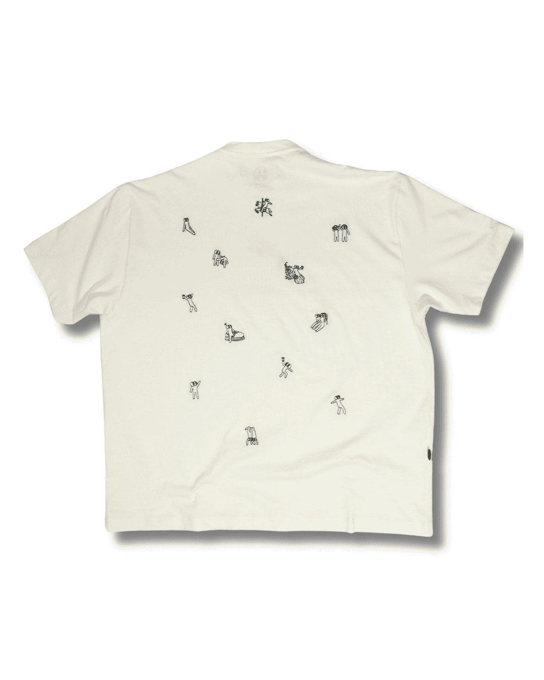Camiseta color crudo en silueta oversized, tela de 150g en algodón 100%. Diseño con detalles bordados en hilo negro en la espalda y frente.